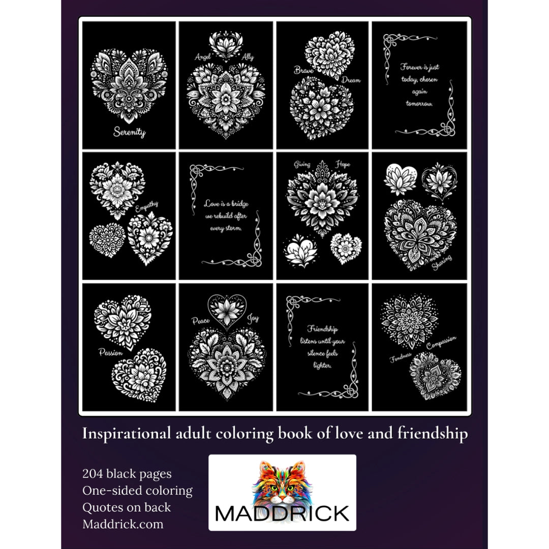 Discover a world of creativity and inspiration with the Love Heart Mandalas Black coloring book. This special edition features a beautiful collection of heart-shaped mandalas on striking black backgrounds, paired with uplifting quotes about love, family, and friendship. Each page is designed to help you relax, express yourself, and celebrate the bonds that matter most.