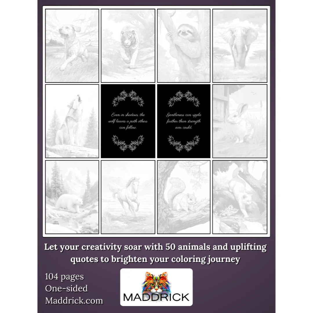 Discover a relaxing and inspiring coloring experience with this grayscale animal coloring book for adults. Each page features realistic wildlife in natural landscapes combined with an uplifting inspirational quote on a black background. Perfect for anyone who enjoys nature coloring, grayscale shading, and meaningful quotes while creating beautiful artwork.